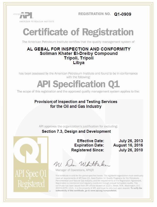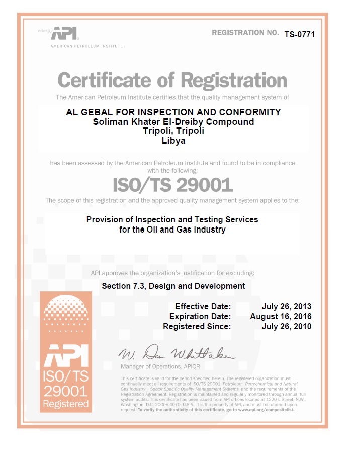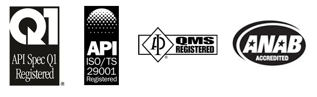 - الشركة معتمدة من معهد النفط الامريكى ومتحصلة على الشهادات(API Spec Q1)، (ISO/TS 29001) و ISO 9001 : 2008 .